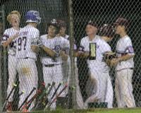 Goffstown players welcome Max Bridgeman and Adam LaFond to the dugout in the fourth inning of Game 2 of the state Little League finals at Precourt Park in Manchester earlier this month. Goffstown lost to Barrington, R.I., in the New England Regional Championship last Saturday in Bristol, Conn.